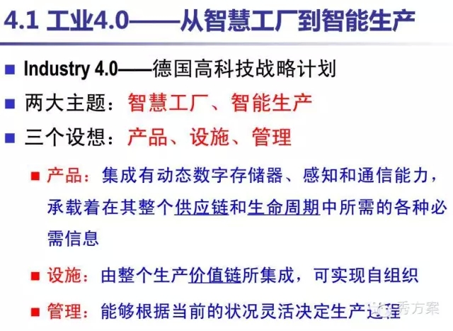 德国工业4.0的本质是基于“信息物理系统”实现“智能工厂”,核心是动态配置的生产方式,首要目标是工厂标准化。德国工业4.0背后的战略意图: 1、对抗美国互联网; 2、防守中国制造业; 3、对于工业4.0,要借鉴也要应对。