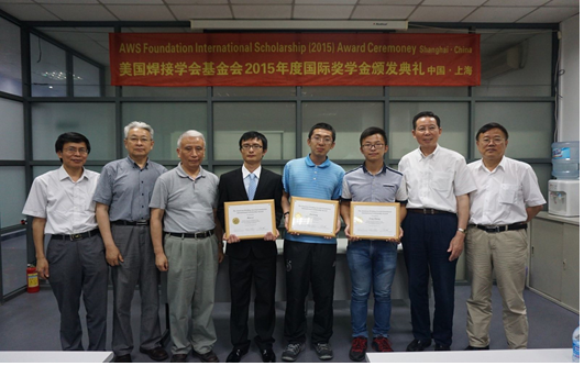 四、国际焊接奖学金 美国焊接学会(AWS)基金部主任Sam先生2015初来沪时,就委托SWS推荐中国在校学习焊接本科以上的优秀学生参与“AWS国际奖学金”的评选与我会进行商洽。双方确定在2015年在中国国内首次颁发AWS国际奖学金。AWS为获奖学生颁发荣誉证书,AWS委托SWS颁发。关于颁发形式,根据情况而定。 AWS奖学金专门设立了“AWS国际奖学金”面向世界各国,但由于门坎较高,对提供申请的材料要求复杂。过去没有中国境内学生申请成功过。AWS国际奖学金每年会给中国一定名额。为我国从事焊接专业的学生今后走出国门,与国外同行相互学习交流提供了一个渠道。上海市焊接学会负责向申请者提供申请需要的AWS的各类表格和要求,学校和学生完成所有材料后交上海焊接学会,SWS收到后会检查材料是否齐全,初审由上海市焊接学会进行。选择后,在每年3月上报AWS基金会理事会讨论决定。奖学金是由AWS直接汇到学生在读大学的账号。奖学金只能作为当年的学生学杂费使用。学生条件主要是学习焊接专业一年以上,成绩是前20%的优秀学生,本科以上(包括博士,硕士生)。 1、2015年AWS焊接奖学金,授予了江苏科技大学的郝辞、龙飞、张峰等三位同学,2015年7月2日在学会咨询培训中心隆重举行美国焊接学会基金会2015年度国际奖学金授奖仪式。江科大材料科学与工程学院党委副书记祁凯副教授、宫照川老师应邀参加了颁奖仪式。上海市焊接学会(SWS)秘书长丁福保、副秘书长冯大成、副理事长刘榴、顾福明、咨询培训中心主任张迺知出席了颁奖仪式。