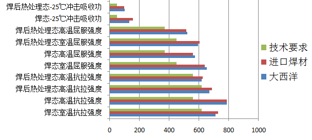 图1 CHW-SEM2HRF/CHF-113HRF与进口焊接材料熔敷金属力学性能对比