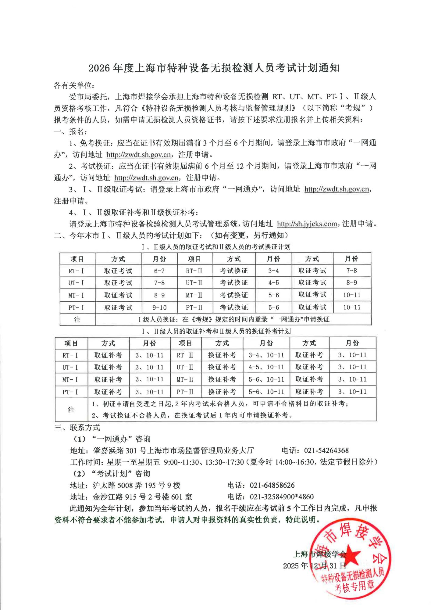 2026年度上海市特种设备无损检测人员考试计划通知